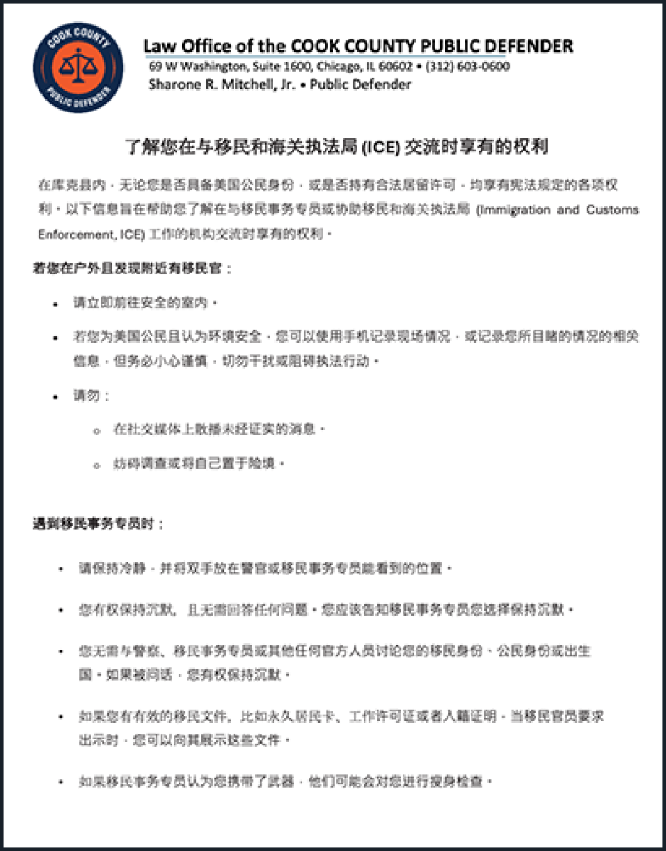 Todas las personas que residen en el Condado Cook, incluyendo las personas indocumentadas y otras que no son ciudadanas de los EE. UU., tienen derechos constitucionales independientemente de su estatus migratorio. La siguiente información está diseñada para ayudarlo a comprender sus derechos cuando interactúa con agentes de inmigración o agencias designadas para ayudar al Servicio de Inmigración y Control de Aduanas (Immigration and Customs Enforcement, ICE).