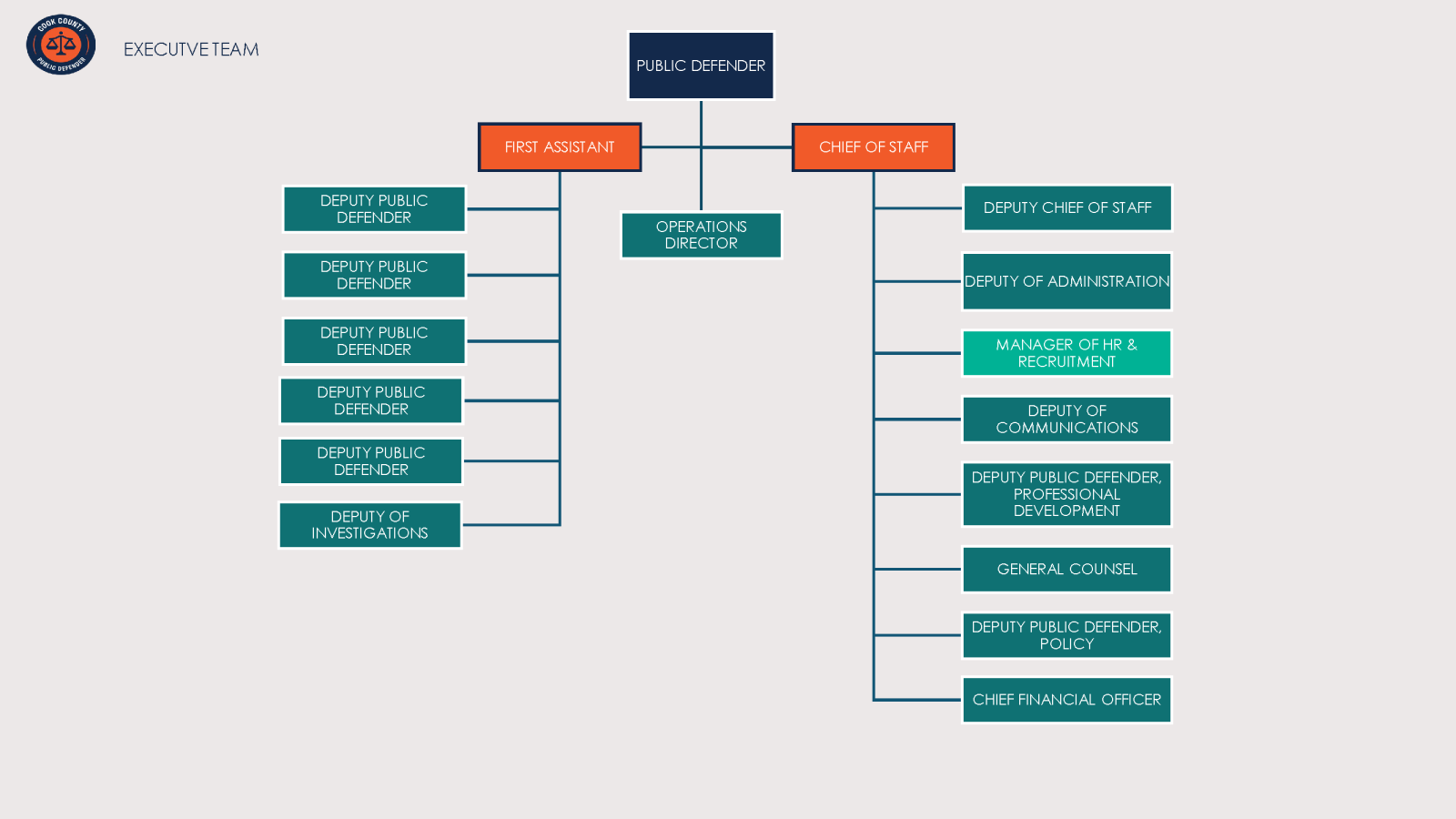 Organizational chart for the Law Office of the Cook County Public Defender as of February 2026.